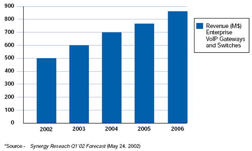 然后, Synergy也預(yù)測(cè)VoIP網(wǎng)關(guān)和交換應(yīng)用從2002年到2006年每年會(huì)有34.6%的增長(zhǎng). 需要產(chǎn)品來(lái)把傳統(tǒng)電話(huà)交換網(wǎng)絡(luò)和IP網(wǎng)絡(luò)橋接起來(lái).