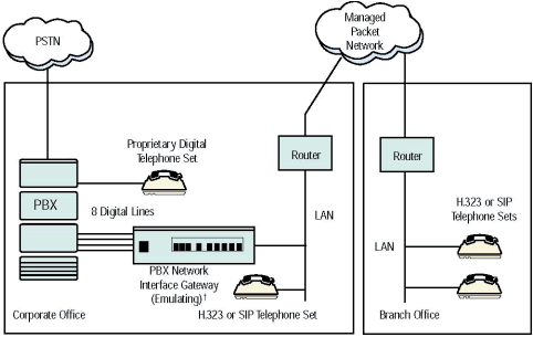 - 場(chǎng)景 2 - 把遠(yuǎn)端辦公室通過(guò)一個(gè)包交換網(wǎng)絡(luò)連接到總公司PBX系統(tǒng)上. 基本來(lái)說(shuō), 網(wǎng)關(guān)把數(shù)字電話(huà)功能擴(kuò)展到遠(yuǎn)程辦公室.